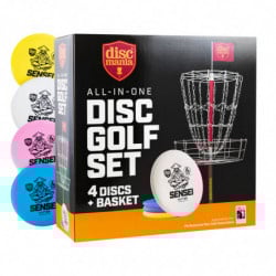 Der rote Mittelpfosten und die Fahne an der Spitze sorgen für optimale Sichtbarkeit auf dem Parcours. Das Set enthält vier flache Sensei-Putter-Discs, die für alle Handgrößen geeignet sind. Diese Discs sind für verschiedene Annäherungsschläge und Putts konzipiert. Ihr Flugverhalten ist sehr neutral, mit einem leichten Fade bei abnehmender Geschwindigkeit und Rotation.
