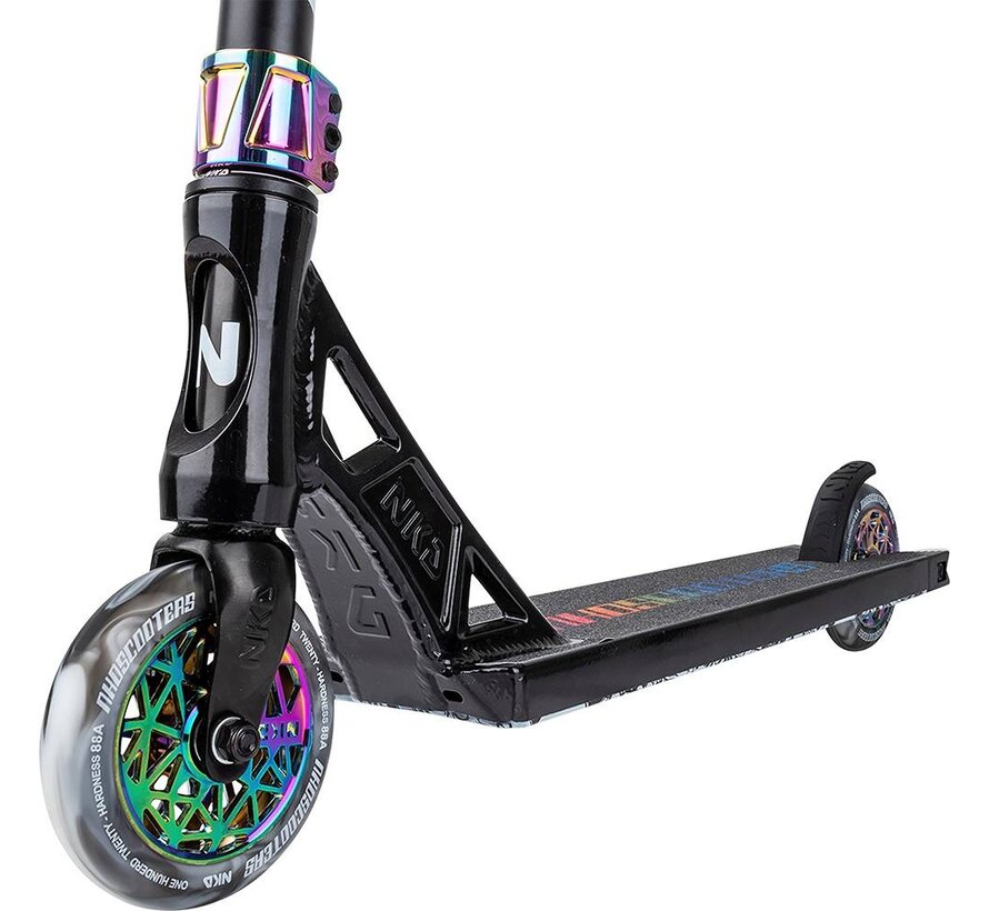 Dieses komplette Stunt-Scooter-Setup basiert auf dem 12 cm x 50 cm (4,7" x 19,7") großen NKD-Gasdeck. Mit Box-Cut-Endstopfen und großen Steuerrohrausschnitten entspricht dieses Deck den neuesten Step-Trends. Das „Gas“-Deck ist der jüngere Bruder des UFO-Decks von NKD Scooters. Dies ist deutlich sichtbar am neuen einzigartigen Hals mit ästhetischen Linien und einem rohen Aussehen! Das Setup bietet die klassische NKD Signature-Gabel, die von einem soliden HIC-Kompressionssystem zusammengehalten wird. Der Lenker ist ein übergroßer Y-Lenker mit geringer Querstangenverstärkung. Bei den Rädern handelt es sich um NKDs neue superleichte Hohlkernräder mit spinnenartigem Design (NKD™ Black Widow) – mit einem Durchmesser von 120 mm vorne und hinten. Abgerundet wird das Setup durch einen festen Halt an den beliebten NKD Shadow-Griffen.