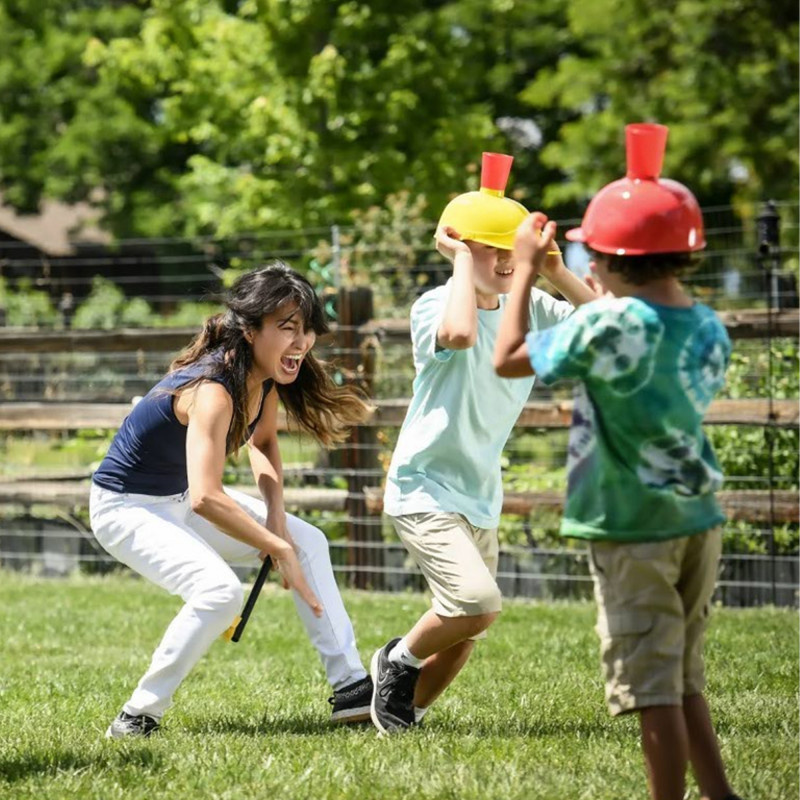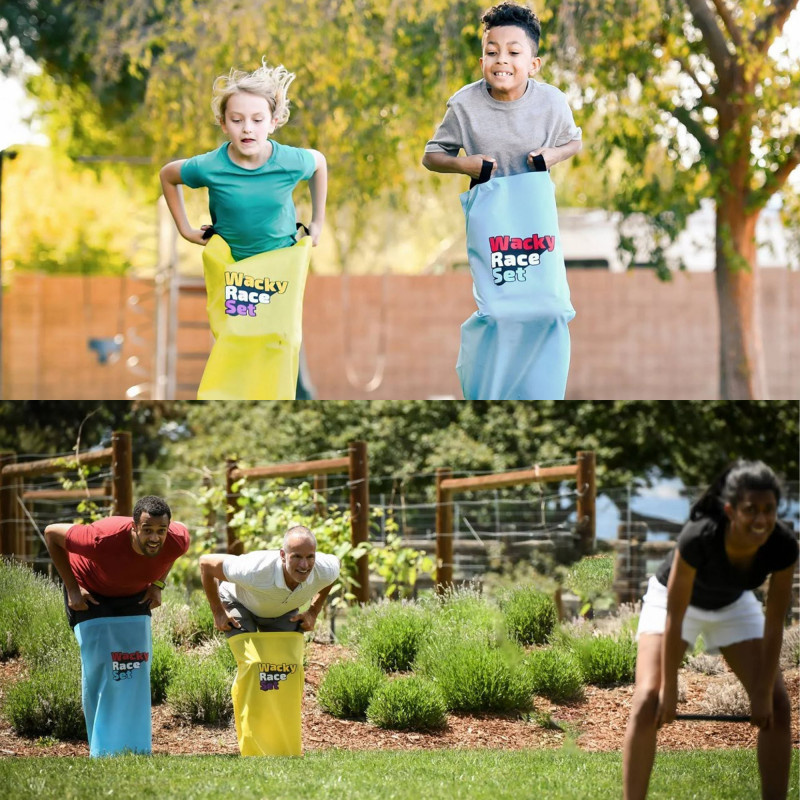 Bring the family together with the 4FUN Wacky Race Set ! A challenging and hilarious course with six activities: hop-sack race, nose-push ball, water helmet transfer, tripod race, vizzy dizzy, and knee walkers. Perfect for kids aged 3 and up, but also fun for grandparents and parents!