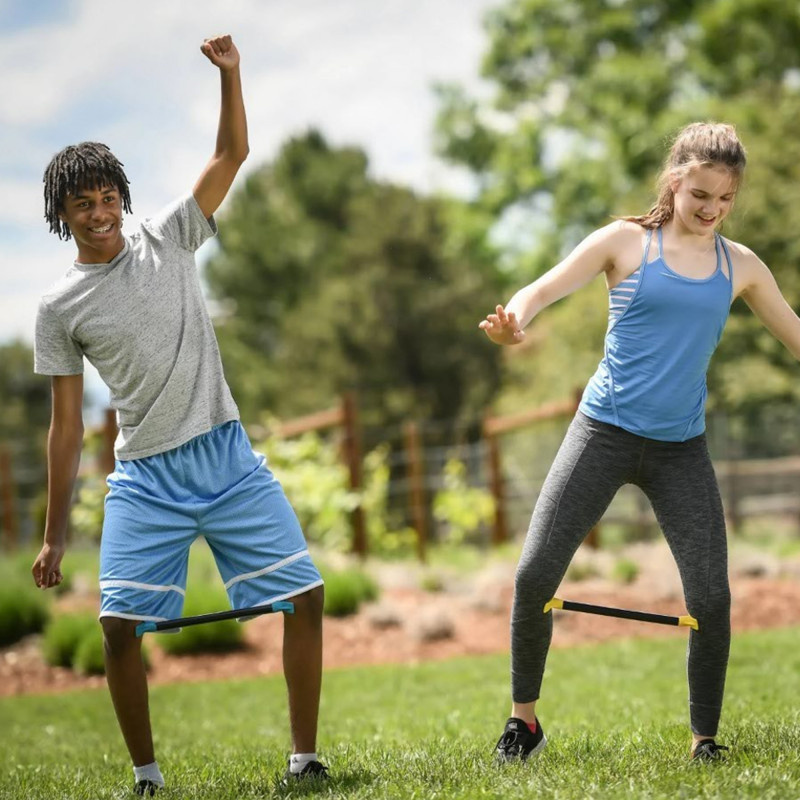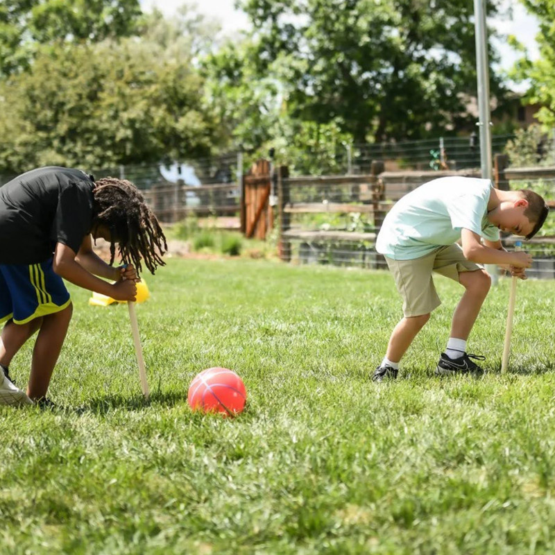 - Contents: 2 hop sacks, 2 balls, 2 helmets with cups, 2 elastic bands, 2 knee spacers, 4 wooden sticks