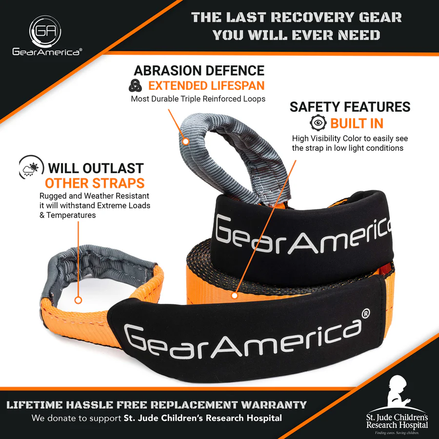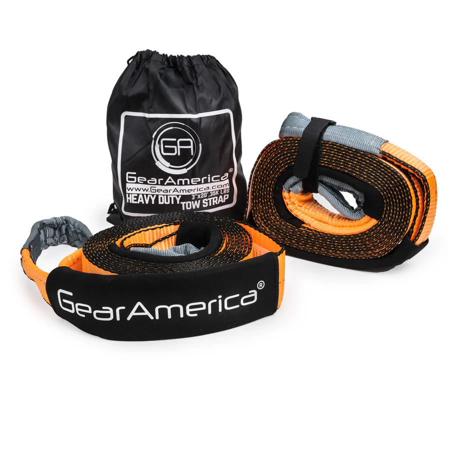 The GearAmerica Heavy Duty Tow Strap 7.6cm x 6.1m (3" x 20') + Tree Saver 7.6cm x 2.4m is a powerful and reliable towing and recovery strap set for off-road use. With an impressive breaking strength of 35,053 lbs (≈ 15,900 kg), this strap is suitable for heavy-duty recovery, pulling stuck vehicles out, and safe winching. Ideal for off-roaders, overlanders, 4x4s, ATVs, and utility vehicles.