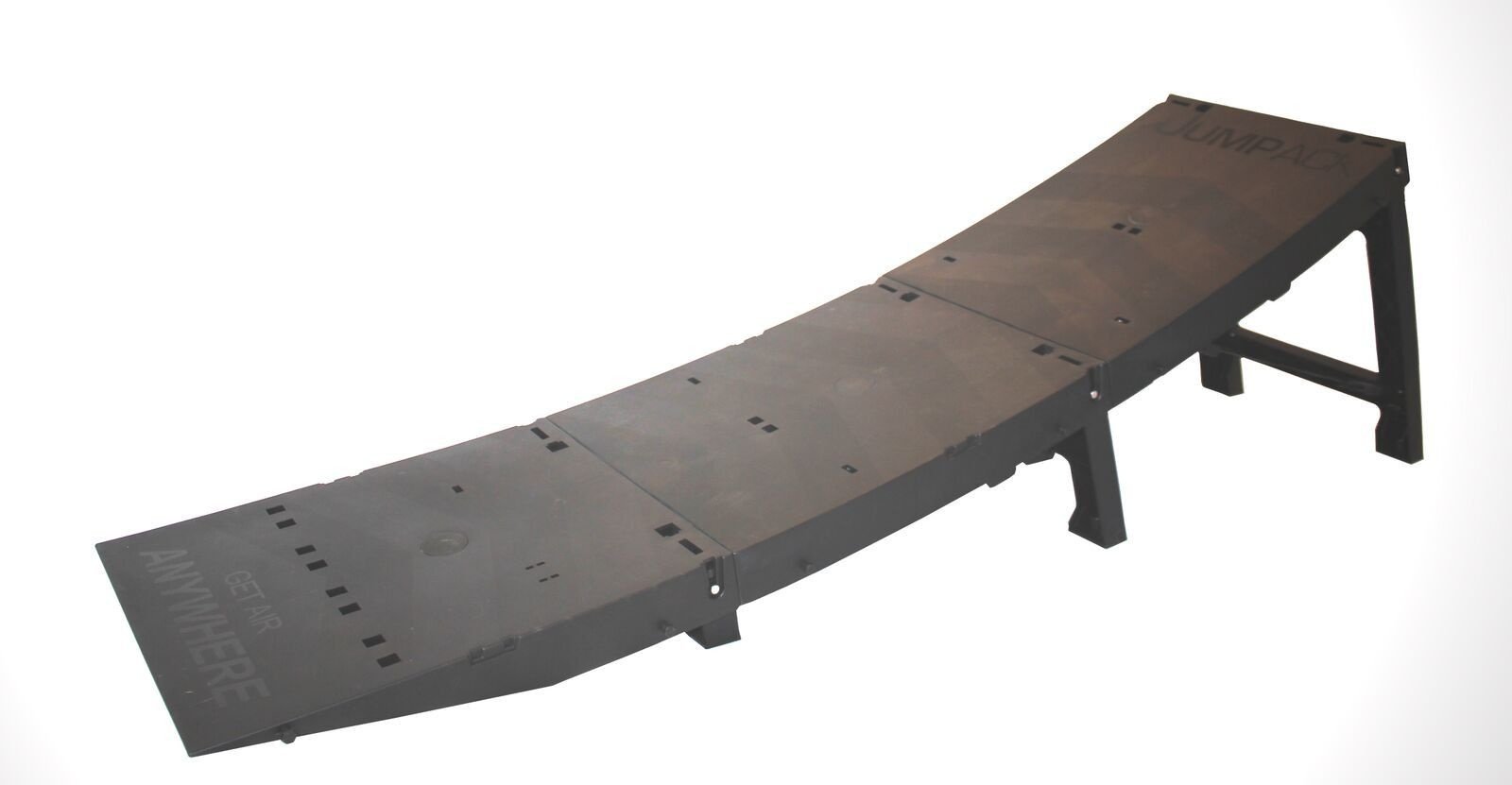 The Jumpack Pro is constructed of strong, impact-resistant materials that can withstand heavy use. Its construction is sturdy enough for high-impact jumps, yet lightweight enough for easy transport. The surface has a tread pattern that provides grip during the approach, while the transition to the underside is smooth to prevent wheels from getting stuck. The ramp's stability is enhanced by a wide base, ensuring it stays firmly planted on various surfaces, such as asphalt, concrete, or skatepark flooring.