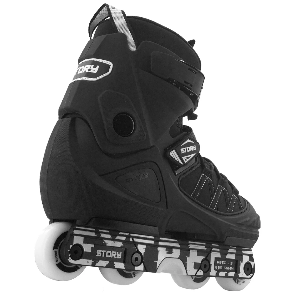 Patines en línea Story Aggressive negros: elegantes patines de acrobacias para principiantes con placa resistente al desgaste y marco de plástico.
