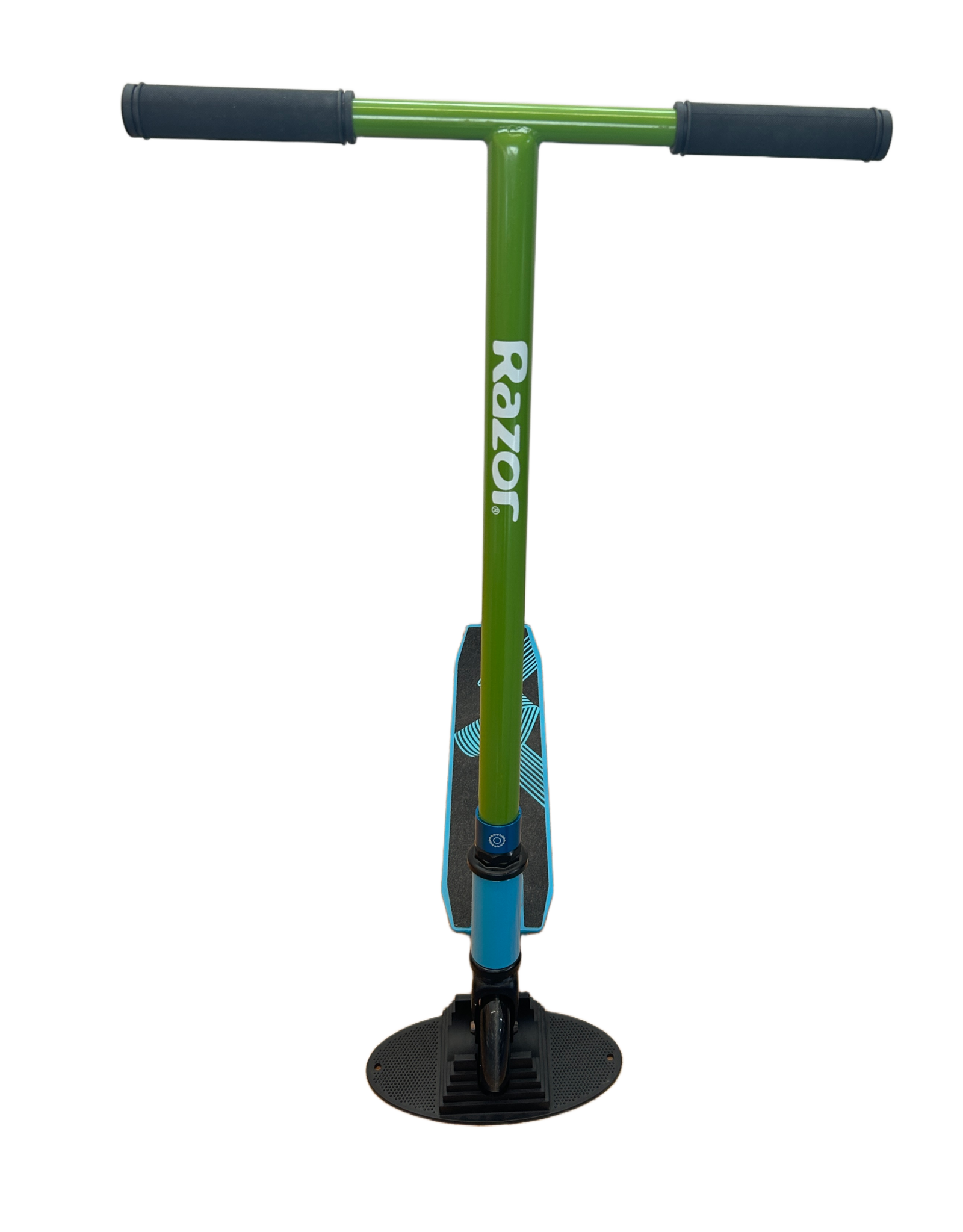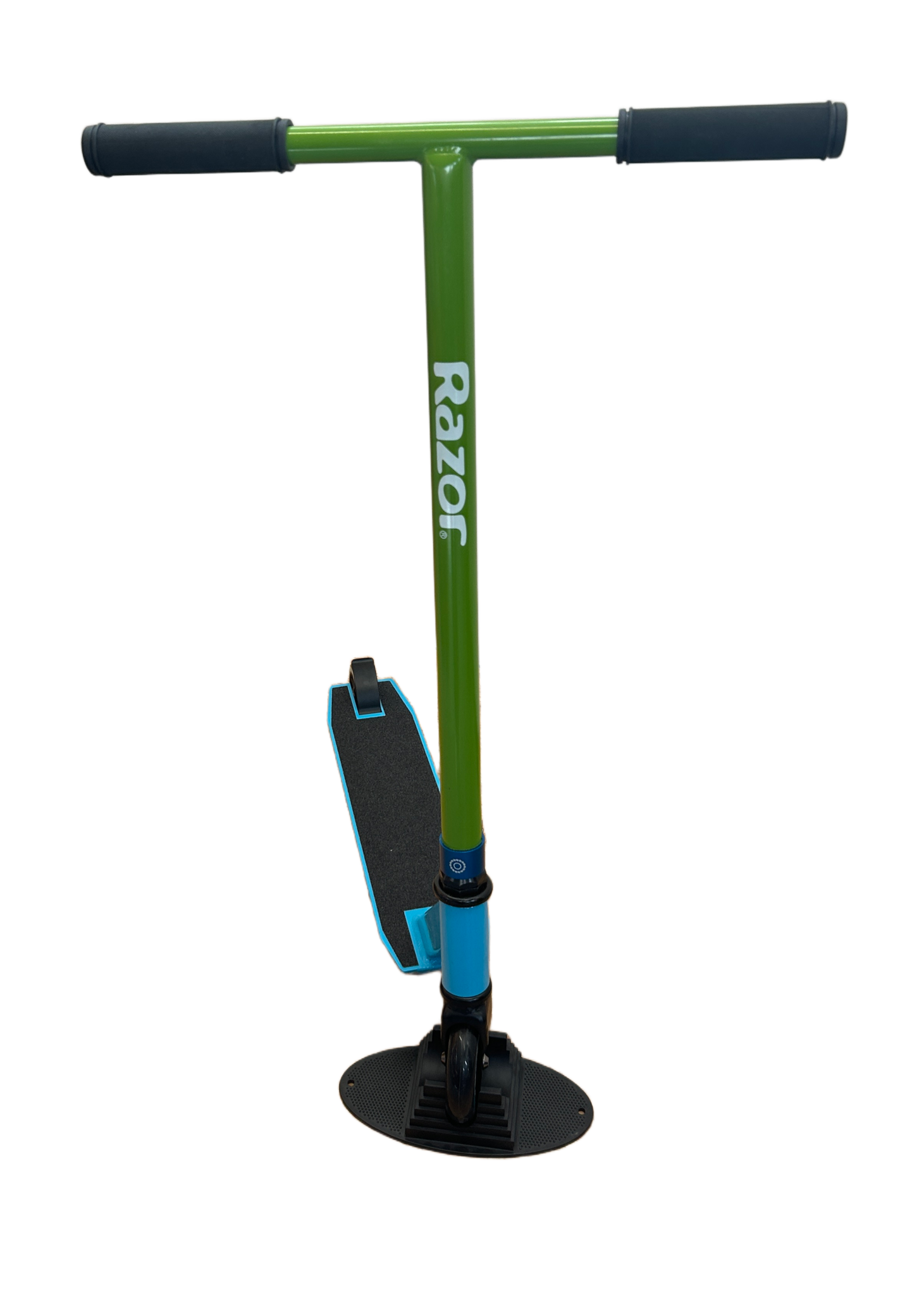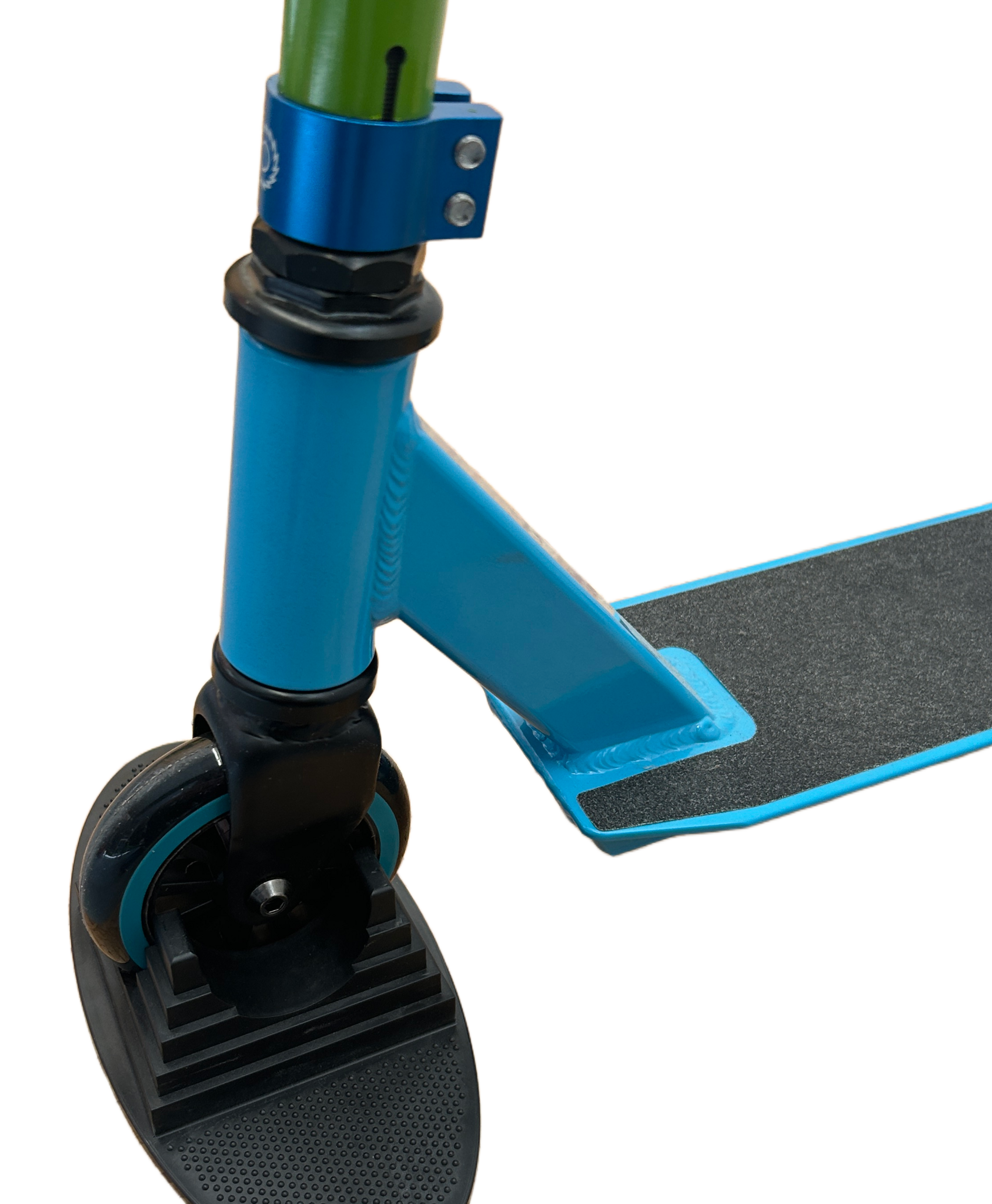 Trottinette freestyle Black Dragon Basic bleue personnalisée, avec collier de serrage et guidon de type « razor ». L'une est équipée du grip d'origine, l'autre d'un grip noir. Livraison impossible.