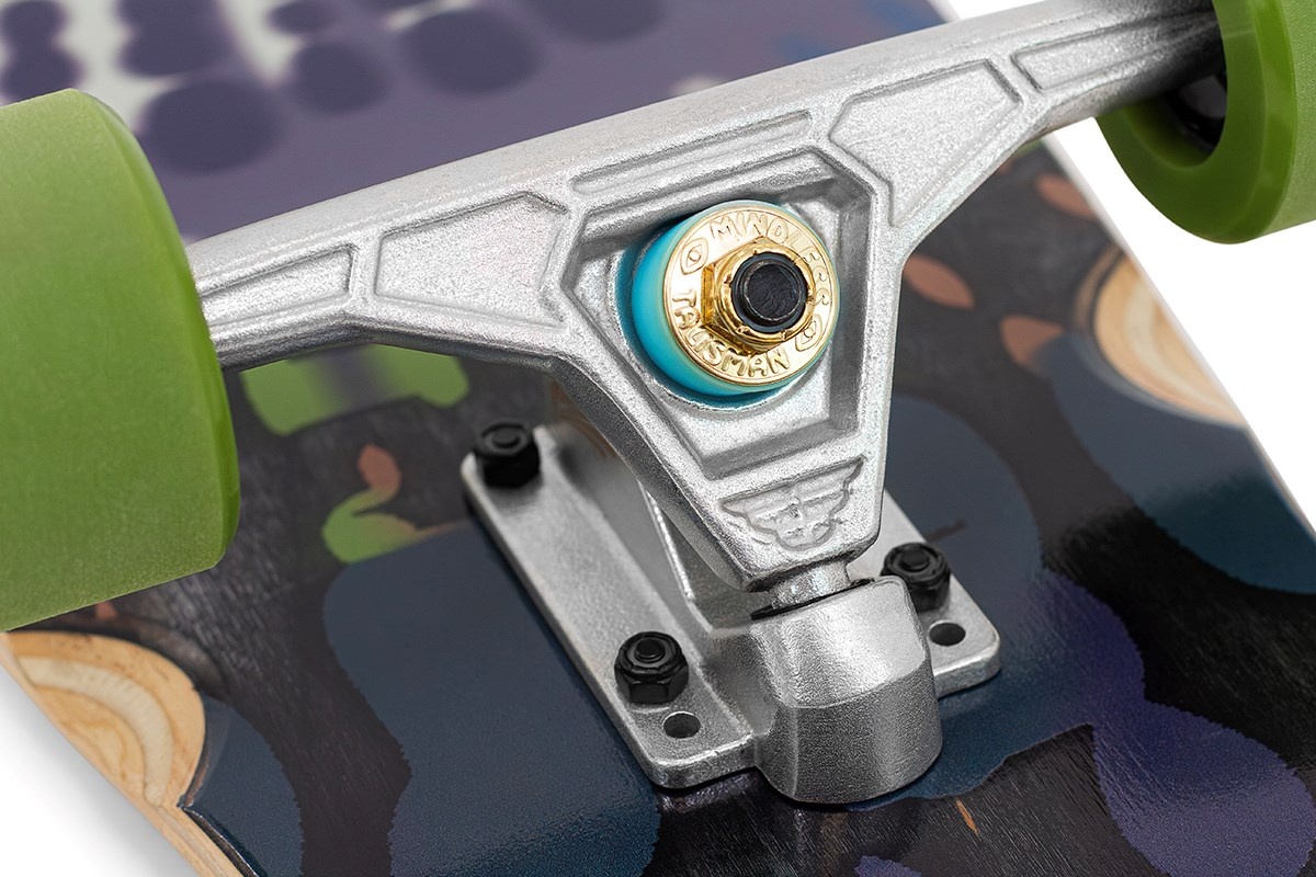 Ce longboard de danse est équipé de trucks Mindless Talisman V2 de 7 pouces . Ces trucks sont dotés de bushings en uréthane 94A, offrant un angle de braquage réactif et une direction fluide. L'angle du kingpin optimise la réactivité de la planche dans les virages et les rotations.