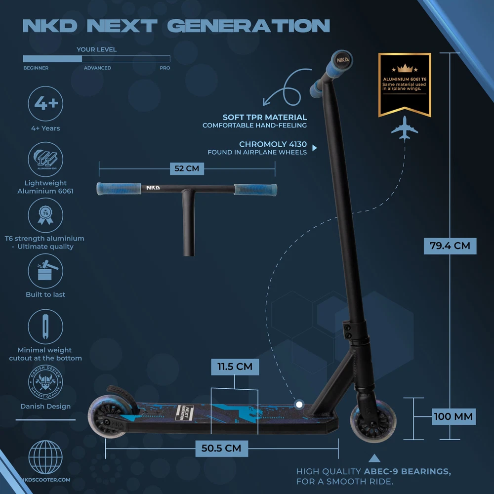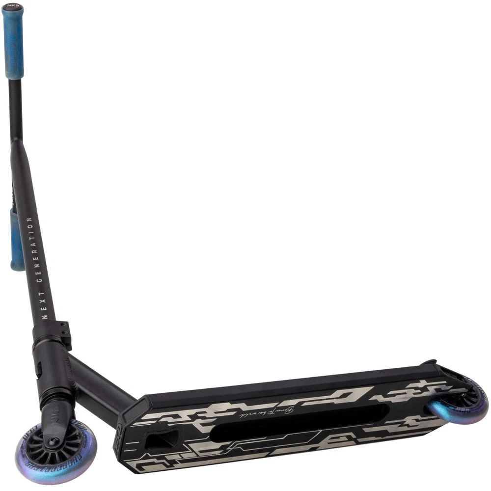 La trottinette freestyle NKD Next Generation est une trottinette pour débutants d'une hauteur de 78 cm. Ses roues de 10 cm facilitent les accélérations. Le jeu de direction est un système de compression IHC sans jeu de direction intégré.