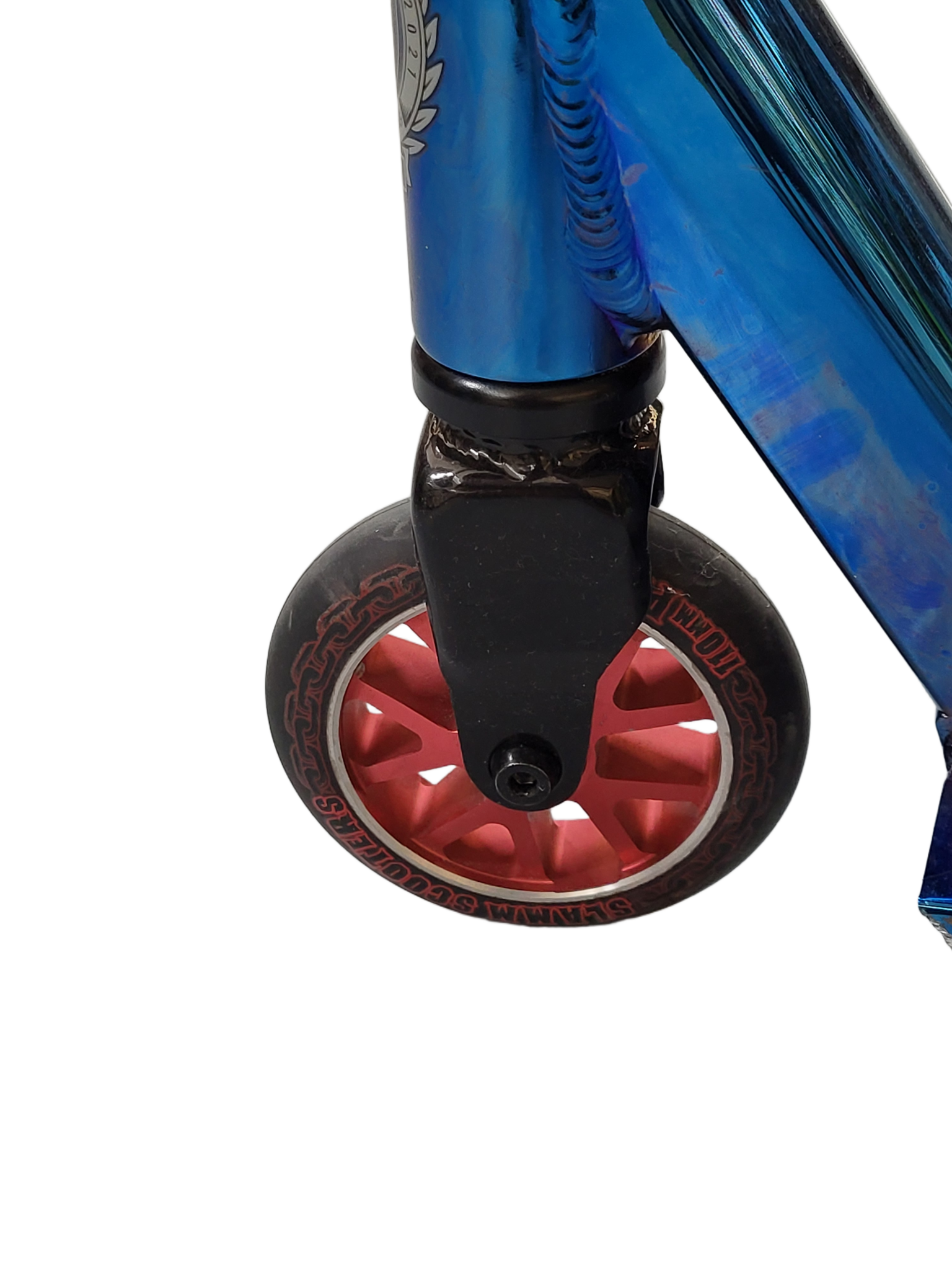 Deze step heeft beschadigingen in de lak, waarbij bij het deck er een hele plak lak verdwenen is. De wielen zijn110mm en in goede staat.
