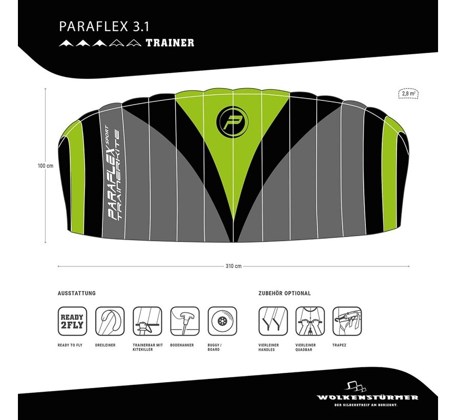 Deze trainerkite is heel geschikt voor beginners, hij vliegt stabiel en sportief tegelijk. Dit is een perfecte combinatie om ervaring op te doen. De Paraflex Trainer 2.3 is Ready to fly en wordt geleverd met 4x20m Dyneema-lijnen op de controlbar met een kitekiller voor de pols en inclusief een grondstick (grondanker). U kunt de grondstick gebruiken om de vlieger aan de grond te pinnen waardoor hij niet wegwaait. Alles is verpakt in een mooie schoudertas.