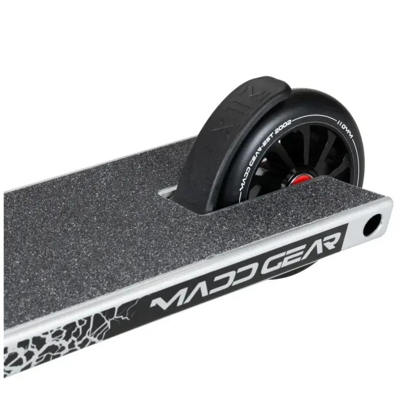 Het deck van de MGX 550 is gemaakt van lichtgewicht 6061 aluminium, versterkt met het MGP Flute-Tech ontwerp dat zorgt voor extra sterkte zonder onnodig gewicht. De afmetingen van het deck zijn 52 cm lang en 14 cm breed (ongeveer 20,5 x 5,5 inch), wat ruim voldoende stabiliteit biedt voor landingen en controle bij spins of grinds. Dankzij de versterkte kopbuis en een geïntegreerde headset is het geheel stijf, duurzaam en direct in respons.