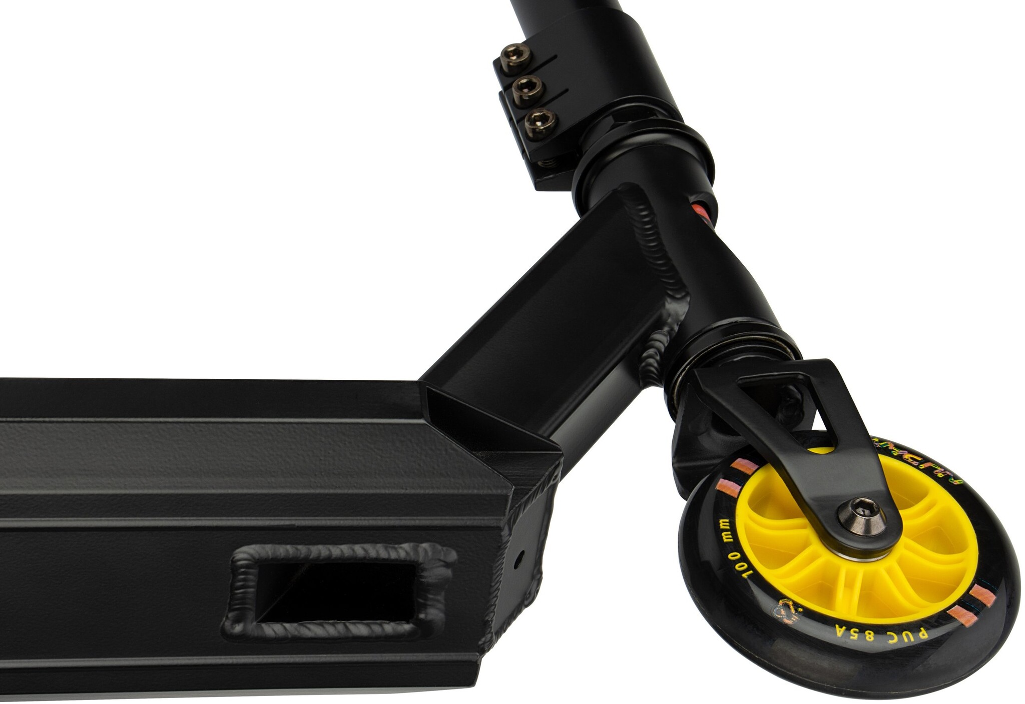 Deze stuntstep is licht, wendbaar en gebouwd voor dagelijks gebruik. Het gesloten aluminium deck met stevige grip tape zorgt voor stabiliteit, terwijl de aluminium T-bar met rubberen grepen je maximale controle geeft. De 85A PU wielen rollen soepel en de ABEC 7 half-chroom lagers bieden precies genoeg snelheid voor beginnende trickriders.
