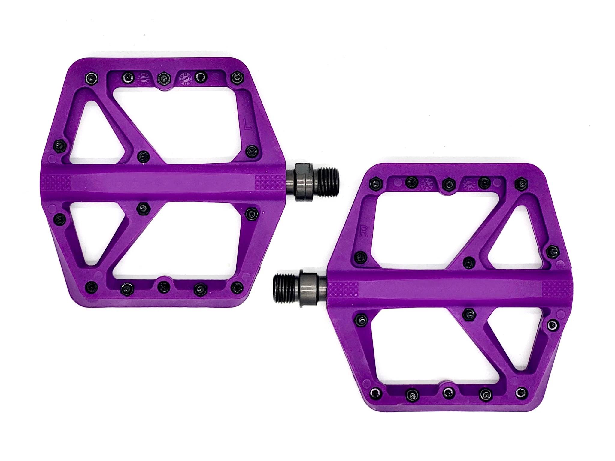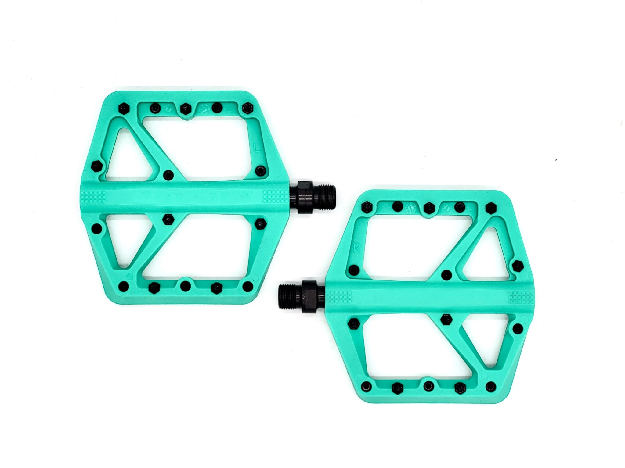 Platte lichtgewicht pedalen met grip pinnen voor meer vrijheid en toch grip, in diverse kleuren en met vervangbare pinnen. Geleverd in een set.