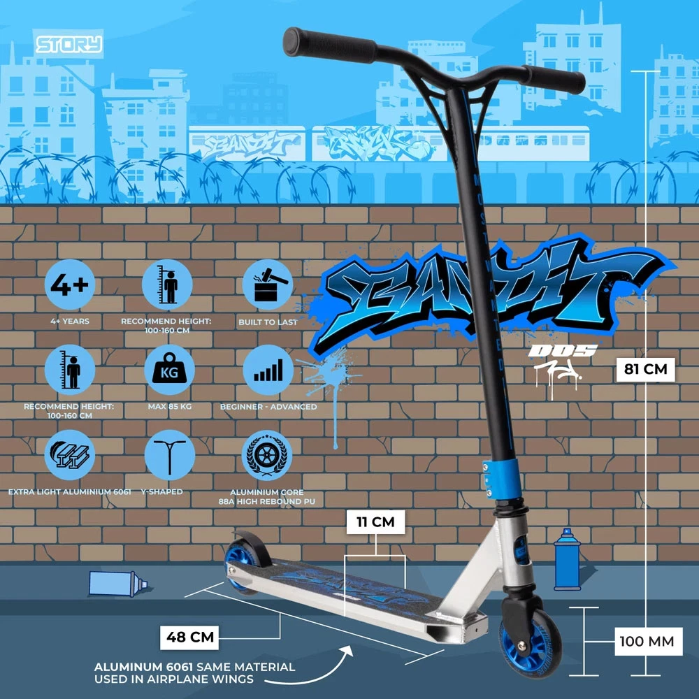 De Story Stuntstep Bandit DOS Silver 81cm is de perfecte keuze voor stuntliefhebbers van elk niveau. Of je nu net begint of al ervaren bent in het uitvoeren van tricks, deze step biedt stabiliteit, duurzaamheid en wendbaarheid. Het stevige aluminium deck en het soepele compressiesysteem zorgen voor maximale controle tijdens het rijden. Bovendien maakt de zilveren-afwerking deze step niet alleen functioneel, maar ook een echte blikvanger!