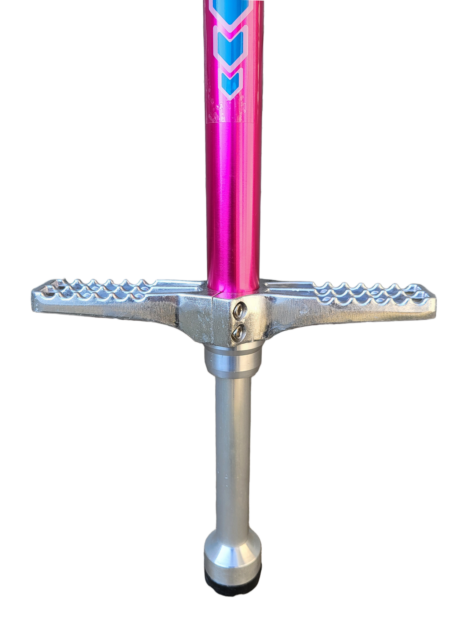 De springveer is opgesloten in een aluminium tube waardoor de pogo geleiding soepeler en veel stiller is. De voetpedalen van de springstok zijn gemaakt van aluminium en voorzien van grove vertanding voor een solide positie van de voeten. De pogo is voorzien van een grote afgeronde jump pad voor betere grip op de ondergrond.
