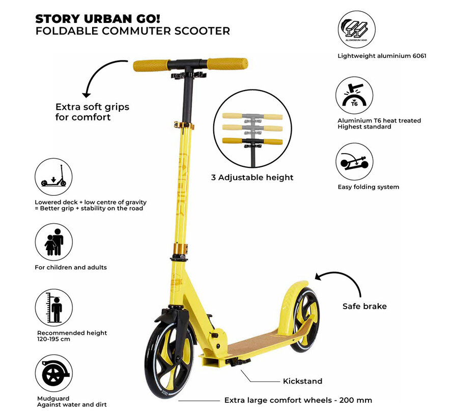 The Story Urban Go Step w świetnej żółtej kurtce to najlepszy towarzysz niemal każdego. Mówimy poważnie, od dzieci w wieku od 3 lat po dorosłych do 185 cm i do 100 kg, prawie każdy może cieszyć się tą jazdą! Nie ma znaczenia, czy idziesz do szkoły, do pracy, czy po prostu chcesz pojeździć po mieście – ta hulajnoga jest dla Ciebie gotowa.